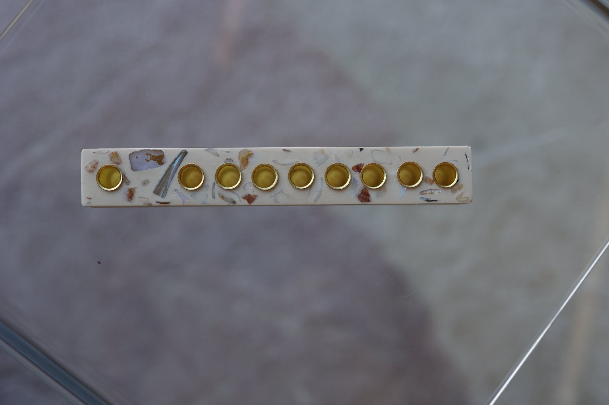 Introducing the Israeli Seashell Chanukah Menorah, a unique blend of tradition and coastal beauty. Handcrafted from eco-friendly Jesmonite, this menorah features real seashells collected from Israeli beaches, creating a distinctive terrazzo pattern. Each piece is individually made, ensuring slight variations that add to its charm. Celebrate the Festival of Lights with a menorah that embodies both heritage and the natural splendor of Israel's shores.